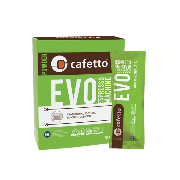 Cafetto EVO espresso clean is a rapidly dissolving soluble and free-rinsing formulation that removes coffee oils, grounds and stains from espresso machine group heads, portafilters and filter baskets.